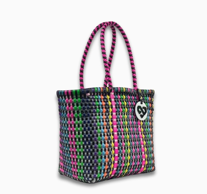 This handwoven XS tote bag is an artisan-made masterpiece crafted from 100% recycled plastic. Featuring a stunning one-of-a-kind design and comfortable handles, these sustainable Mexican bags are lightweight, waterproof, and perfect for beach trips, farmer's markets or running errands. Each one represents creativity and a commitment to the environment, enabling you to showcase your individuality while making a positive impact on our planet. Measurements: Height: 9 in Depth: 5 in Length: 10 in Handles: 8 in