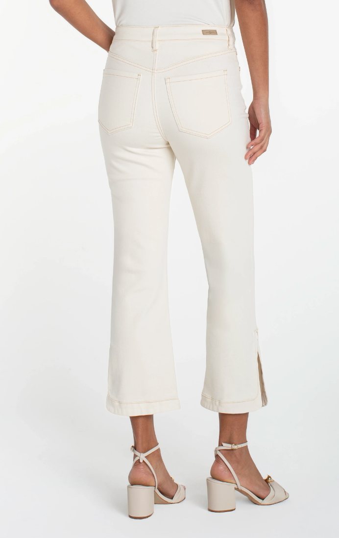A modern crop flare designed with a subtle kick at the hem. The tulip hem adds soft shape and movement, giving this classic silhouette a fresh update. Polished with structure, easy with stretch. Style it with the matching collarless jacket for a coordinated, statement set.
