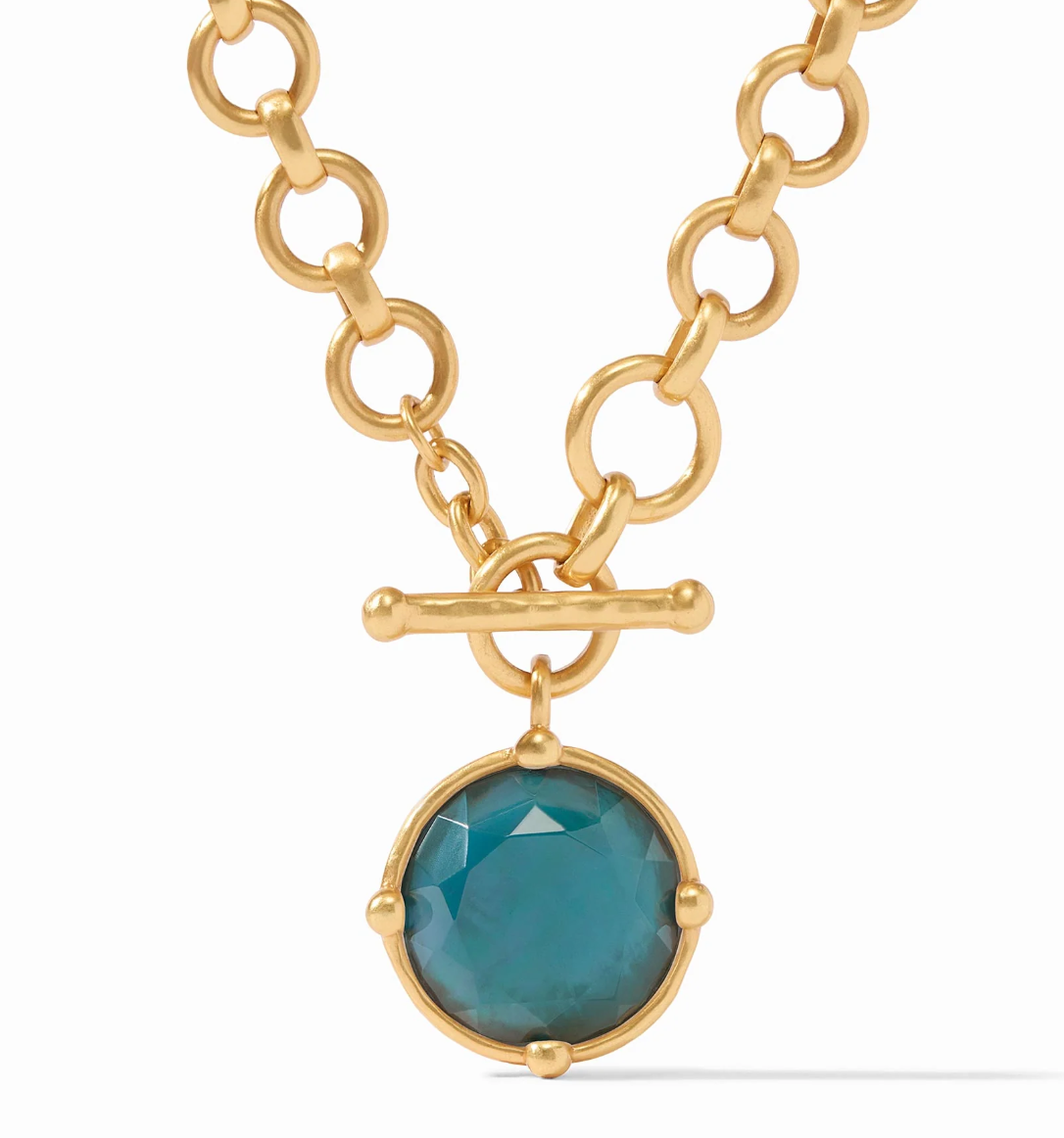 This demi-sized version of a favorite necklace has two ways to wear: Show the rose cut stone accented with golden beads or flip it to display a detailed bas relief bee.