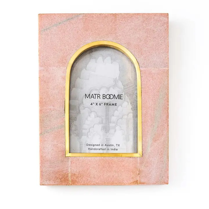 Introduce a touch of elegance with the Jaipuri 4x6 Arch Picture Frame, beautifully crafted from pink carved marble and adorned with brass inlay. Inspired by the enchanting arches & rosy tones of the 'Pink City', Jaipur, this frame showcases your favorite memories with a stunning artistic flair. Perfect for any tabletop, it combines timeless design with the warmth of fair trade craftsmanship.