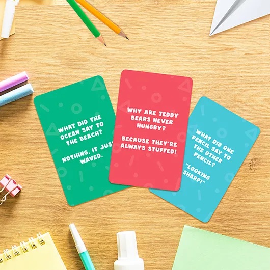 Get ready for non-stop giggles with Kids Jokes, the super silly joke card pack designed to keep children laughing for hours. Filled with 100 hilarious kid-friendly jokes, this playful set is perfect for sharing at parties, taking on road trips, adding fun to lunch breaks or simply brightening a quiet afternoon at home. With classics like “What do you call a bear with no teeth? A gummy bear!”, “What do you call a sleeping dinosaur? A dino-snore!” and “What’s orange and sounds like a parrot? A carrot!”, this pack makes it easy for kids to entertain friends and family with clean, memorable jokes.