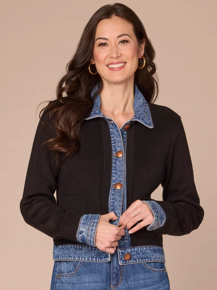 This mixed media jacket blends the structure and charm of a denim layer with the versatility and softness of a cardigan. With long sleeves, a collar, button front, side pockets, and curved hem, this twofer style is unique and fun to wear.