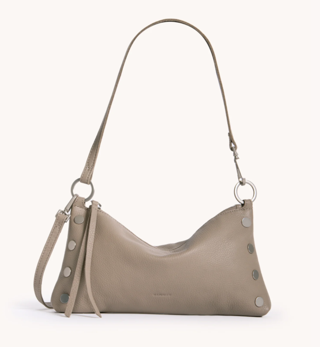 This fresh, of-the-moment bag is a must-have companion for nights on the town. Featuring a slouchy but current shape, in our classic pewter leather, this versatile little number transitions from a wristlet to a shoulder bag in seconds flat. The Kyle also includes a removable and adjustable crossbody strap, so you can go hands-free and allows the Kyle to be worn 3 different ways depending on your look!
