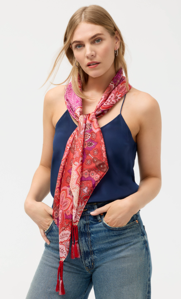 Crafted from luxurious 100% silk, the Lantana Silk Scarf is adorned with a rich pattern accented with vibrant color and bold florals. Thoughtfully designed to enhance any look, this square scarf is finished with tassels at each corner for added texture. Tie at the neck or at the handle of your favorite back for a pop of color.