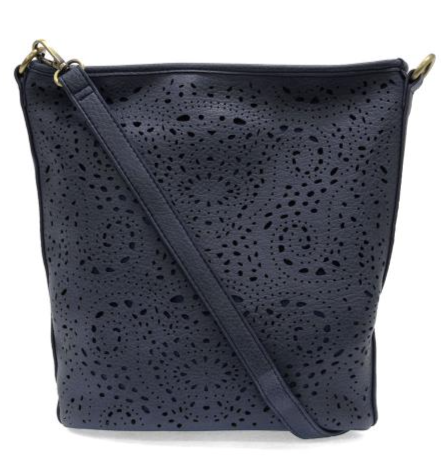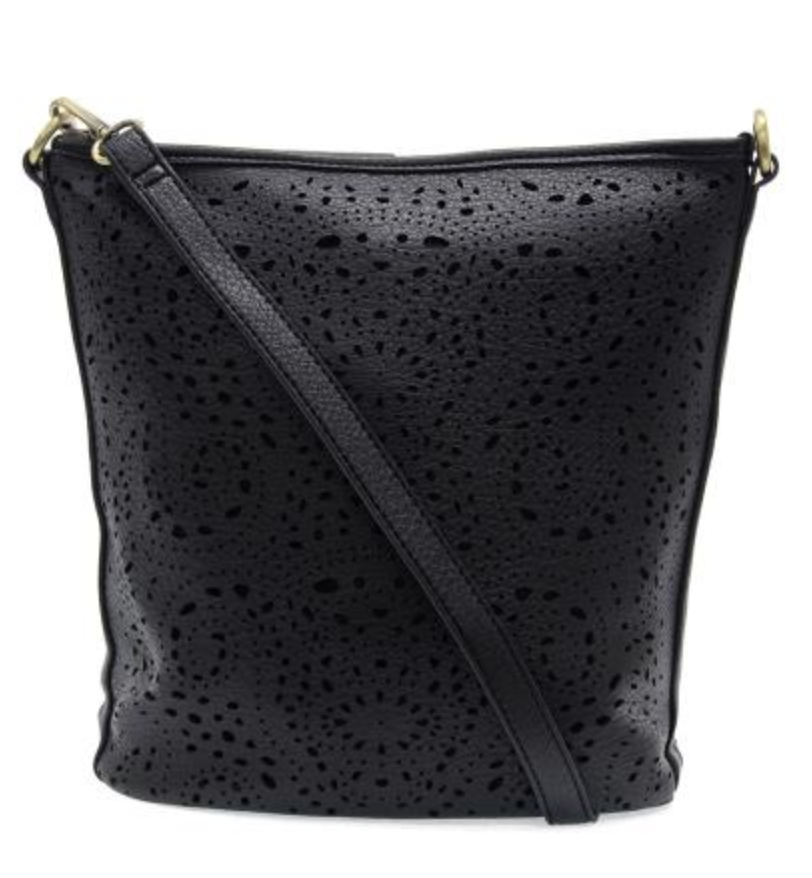 This slouchy bucket bag is fashioned in soft vegan leather accented with a feminine, delicate laser cut pattern reminiscent of eyelet lace for a luxe boho look. A top zip closure keeps your belongings secure with enough space for everything you need to carry on a daily basis. The back zipper pocket keeps your phone or keys in easy reach, and the adjustable shoulder strap can be worn as a crossbody or shoulder bag.