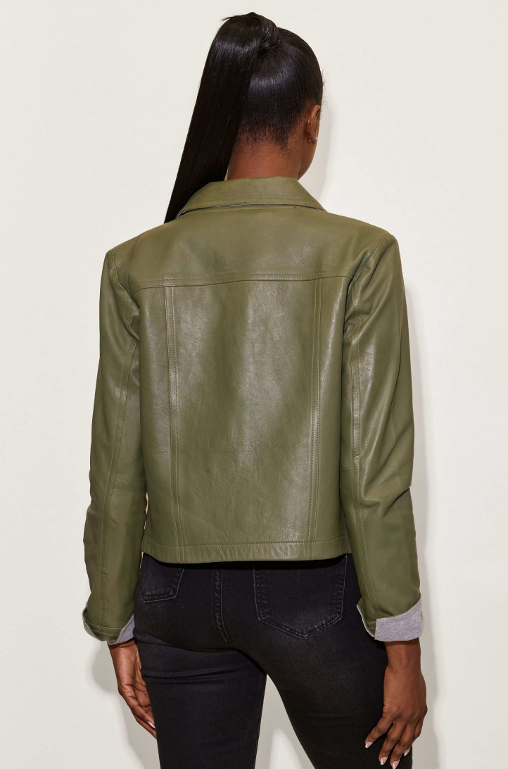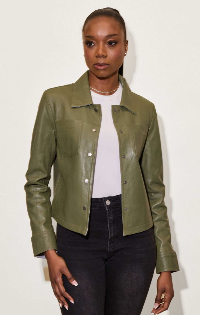 The Lefei Jacket blends style and comfort, making it the ultimate wardrobe staple. This cropped, collared shirt jacket is crafted with light leather bonded to a poly-cotton blend fabric, offering a unique and fashionable edge.