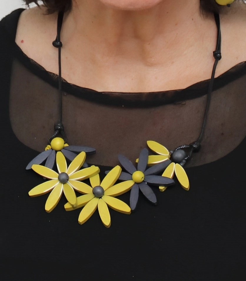 The Lime Garland Nectar Statement Necklace showcases a graceful wreath of five flowers in serene lime, charcoal and white wood tones. Crafted to be lightweight, it offers comfortable wear throughout the day. The adjustable wax cord ensures a perfect fit, making this versatile piece an elegant addition to both casual and formal wardrobes.