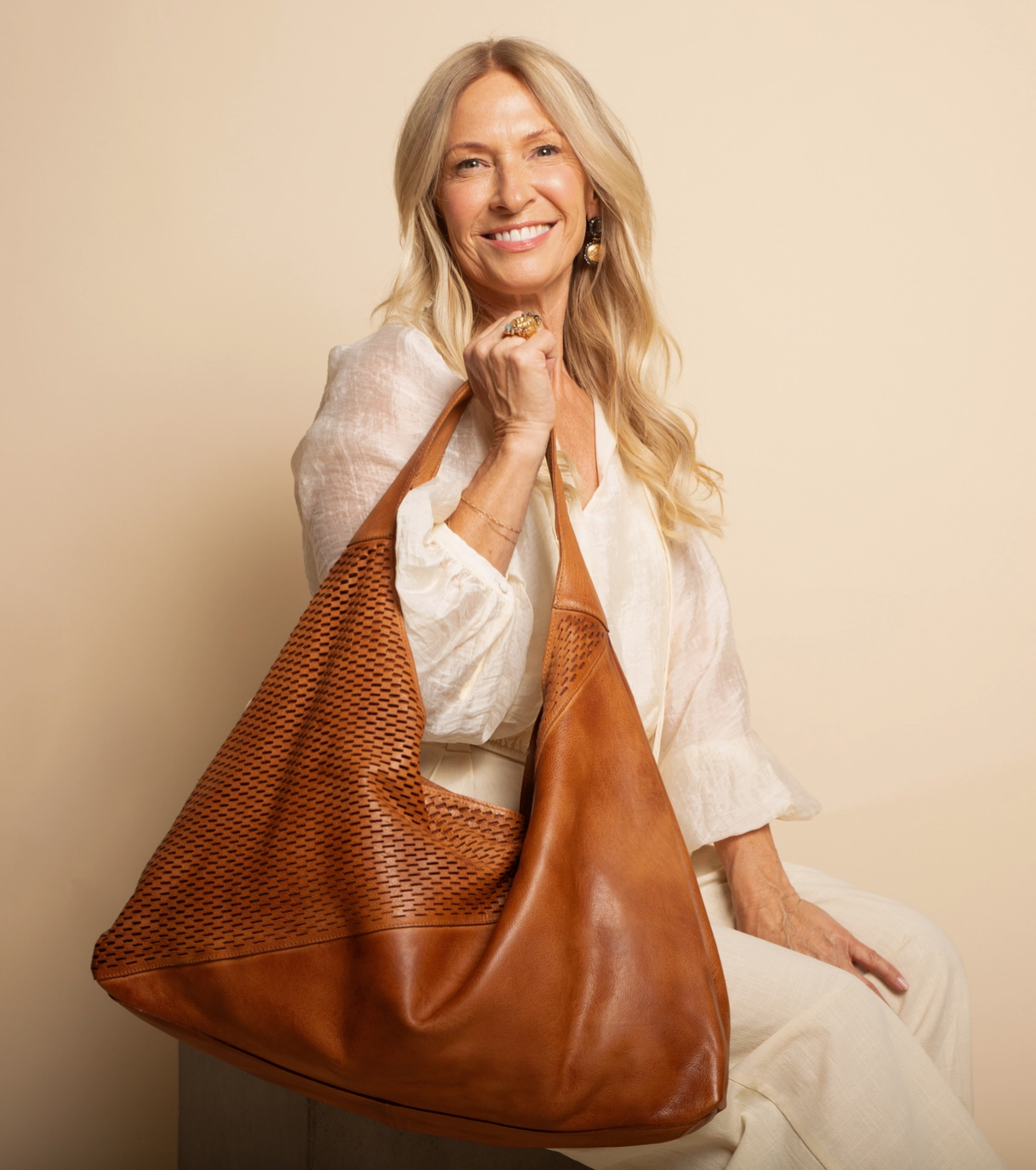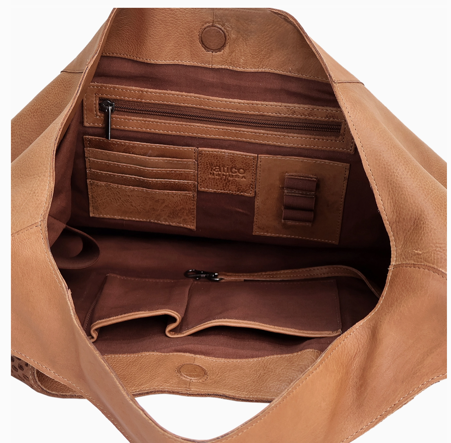 Oversized full-grain leather tote with internal organization and a wide shoulder strap