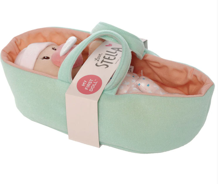 The Love, Stella dolls are the perfect size for holding, hugging, and nurturing role play to foster social and emotional development. My First dolls are 100% soft with a sewn-on onesie, removable hat, and a signature magnetic pacifier design. Their bald heads are slightly weighted with embroidered facial features. Their squishy-soft body has a lightly weighted bottom and sits unassisted. This adorable set comes with a soft bassinet to encourage caring for this delightful baby doll.
