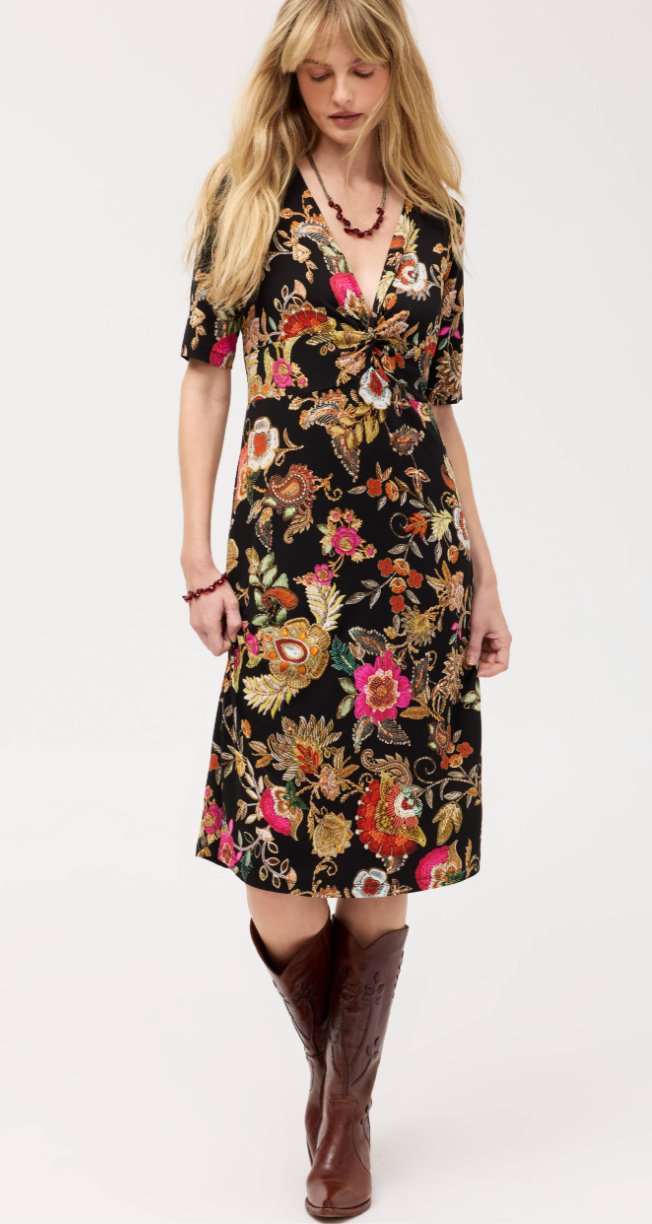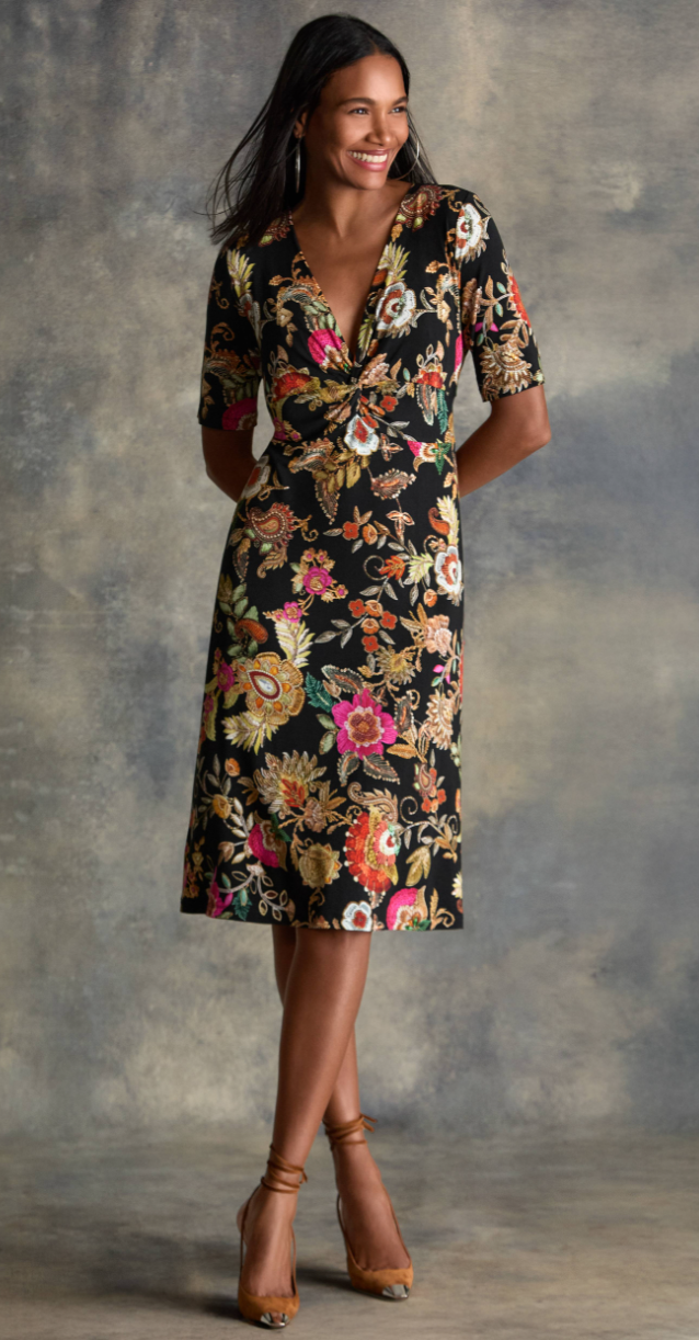 Crafted from a lightweight fabric with a hint of stretch, the Janie Favorite Twist Front Midi Swing Dress offers a fresh take on a classic feminine silhouette. Featuring a V-neckline with a twist front detail, this dress is finished with an A-line silhouette. Pair with coordinating pumps and a retro-inspired handbag for a dinner date.