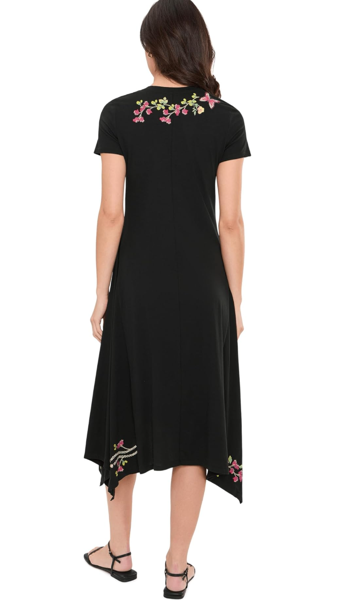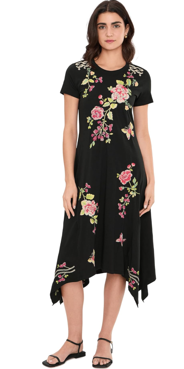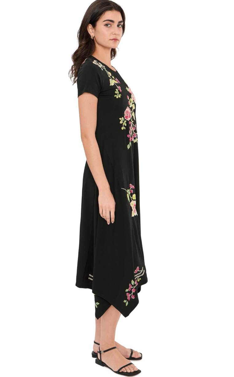 - Indulge in the exquisite charm and details of the Johnny Was® Handkerchief Hem Knit Dress with crew neck and short sleeves. Soft floral print drifts across flowing black fabric, creating a look that feels both tender and timeless. With every movement, this pull-on style dress tells a quiet love story - effortless, graceful, and endlessly romantic.