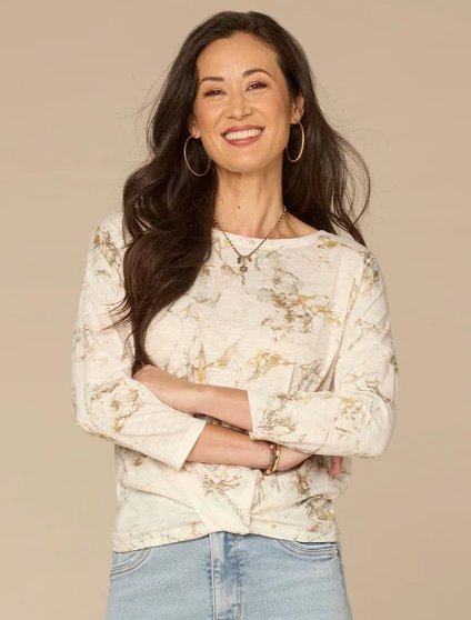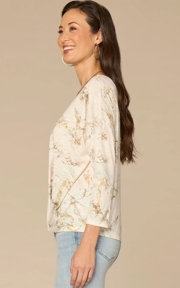 With a classic fit and on-trend marble print, you’ll reach for this knit top repeatedly. It’s also designed with three quarter drop shoulder sleeves, a scoop neck, and twist front hem.