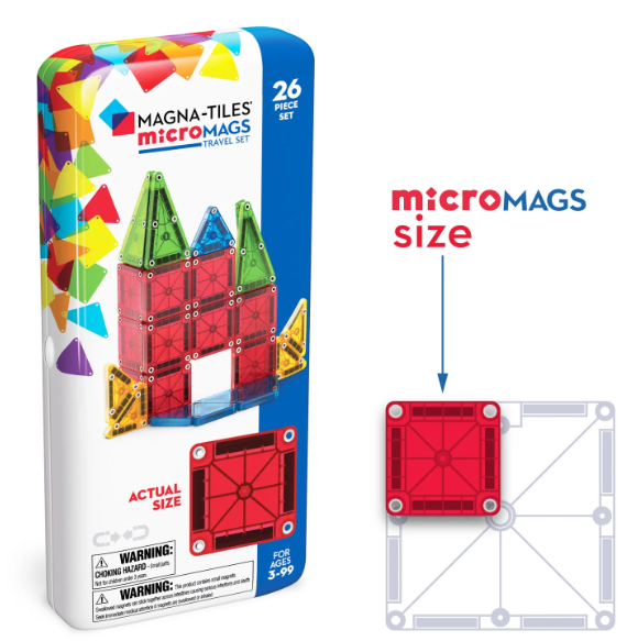 What’s Included: 26 microMAGS magnetic tiles, including: 4 Right Triangles, 4 Isosceles Triangles, 6 Equilateral Triangles, 12 Squares. The metal tin packaging provides both convenient storage and baseplate for builds on the go.