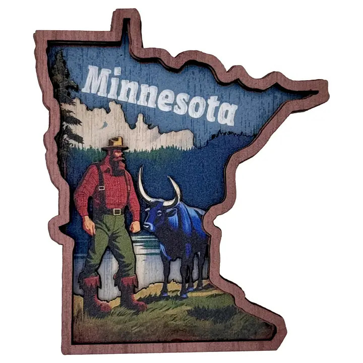 This beautifully crafted Minnesota-shaped wood magnet features four intricately layered pieces, adding depth and dimension to its design. At the heart of the magnet is a charming depiction of Paul Bunyan and Babe the Blue Ox, the legendary duo synonymous with Minnesota folklore. Each layer is precision-cut from quality wood, creating a striking 3D effect that brings the iconic imagery to life. Perfect for adding a rustic, Northwoods touch to any fridge or magnetic surface, this magnet is a must-have keepsake for lovers of Minnesota and its rich traditions.