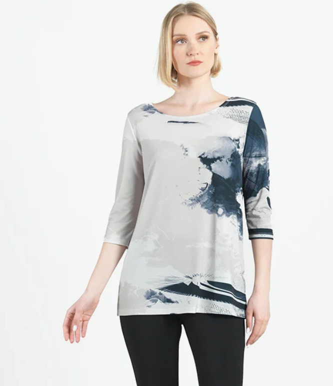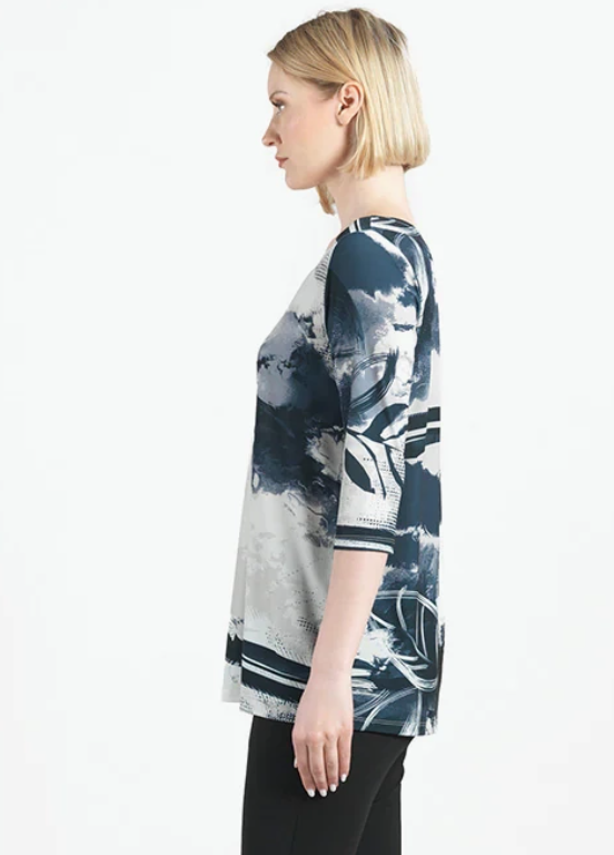 This stunning tunic features a round scoop neckline, fitted elbow-length sleeves, and a straight hemline.