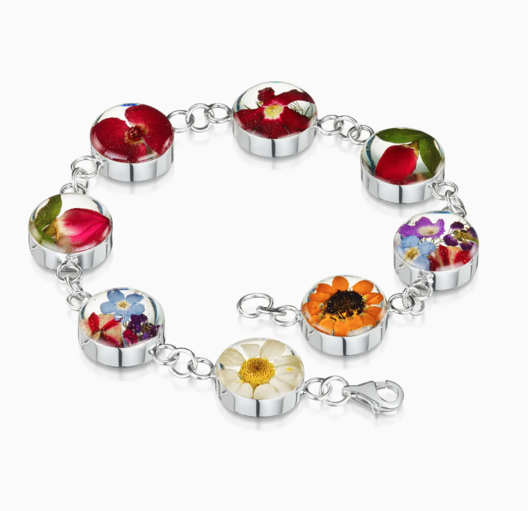 Adorn your wrist with the exquisite beauty of our Sterling Silver Bracelet, handmade by Shrieking Violet®. This stunning piece features a vibrant array of real flowers, including forget-me-nots, miniature roses, pansies, pink verbenas, mini sunflowers (brown-eyed Susans), daisies, and Euphorbia Milii (resembling tiny poppies). Each flower is meticulously preserved in resin and set within elegant round links, making this bracelet a perfect gift for her.
