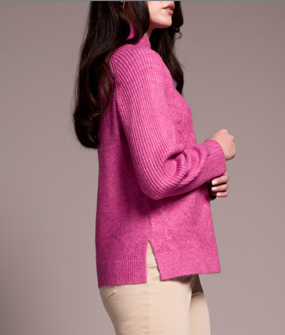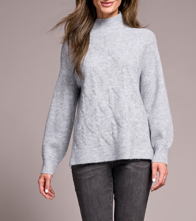 Cooler days call for this cozy sweater, crafted from a soft blend yarn with a rich texture for a luxurious feel. A sleek mock neckline and long puff sleeves add effortless elegance, while fitted cuffs create a refined finish.