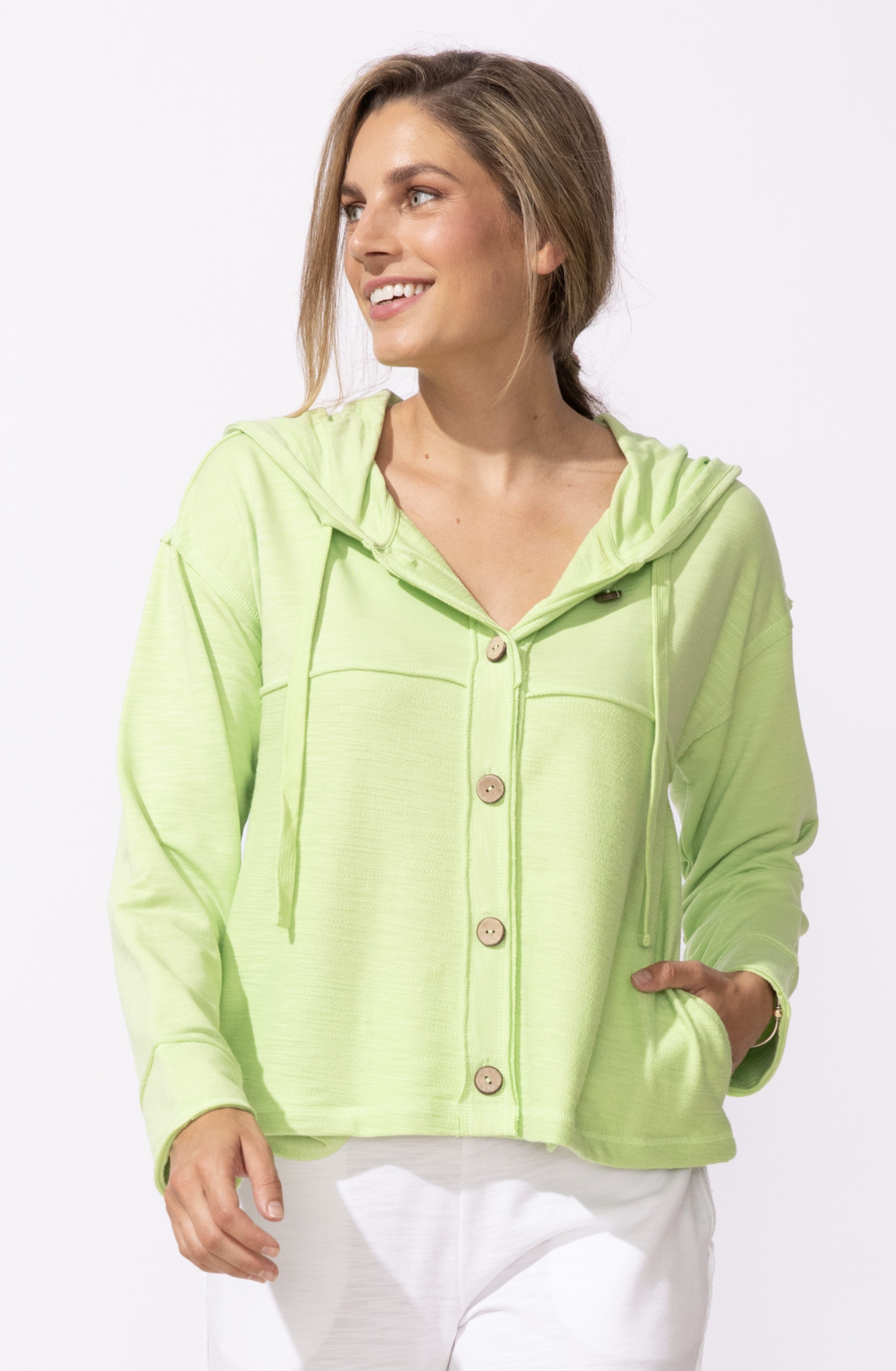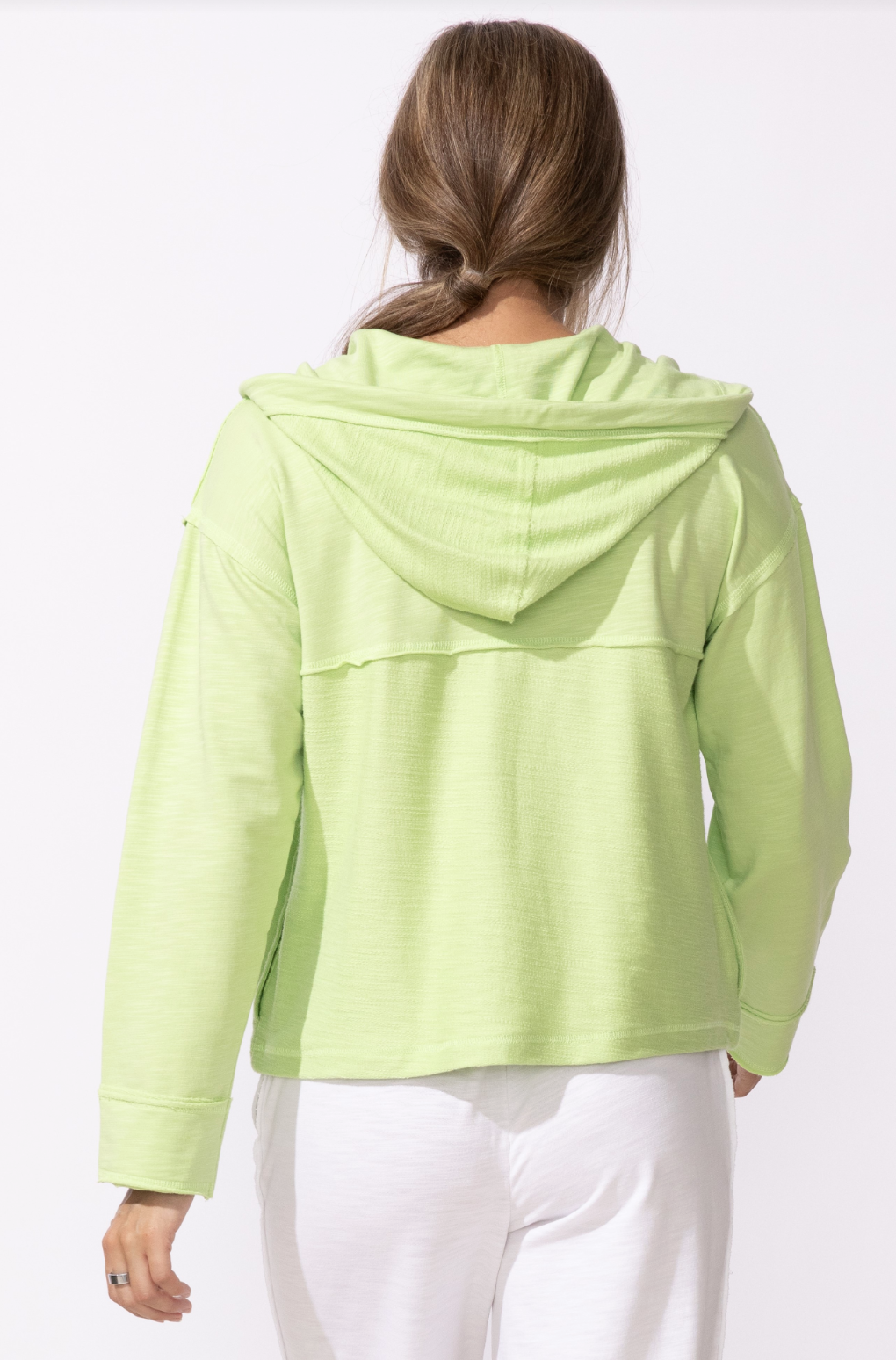 The piece you will grab when a super soft comfy and cute layer is needed. Cotton modal with a touch of spandex holds its shape well and moves with you throughout your day. Reversed fabric, raw-edged seams, dyed to match drawstring. All the fun details elevate your go to hoodie.