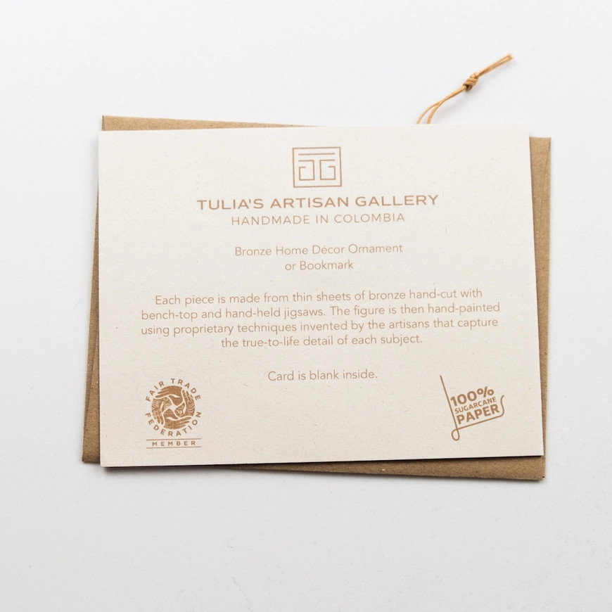 The perfect gift for any bird lover. Handcrafted from paper-thin sheets of bronze.  These exquisite ornaments are cut, filed, polished, and painted by hand using proprietary techniques by a husband and wife team of artists in central Colombia who create fair wage jobs in their local community. Each ornament comes with a blank notecard & envelope printed on sugar cane paper. A perfect way to send a note of thanks, get well, sympathy, or birthday wishes.