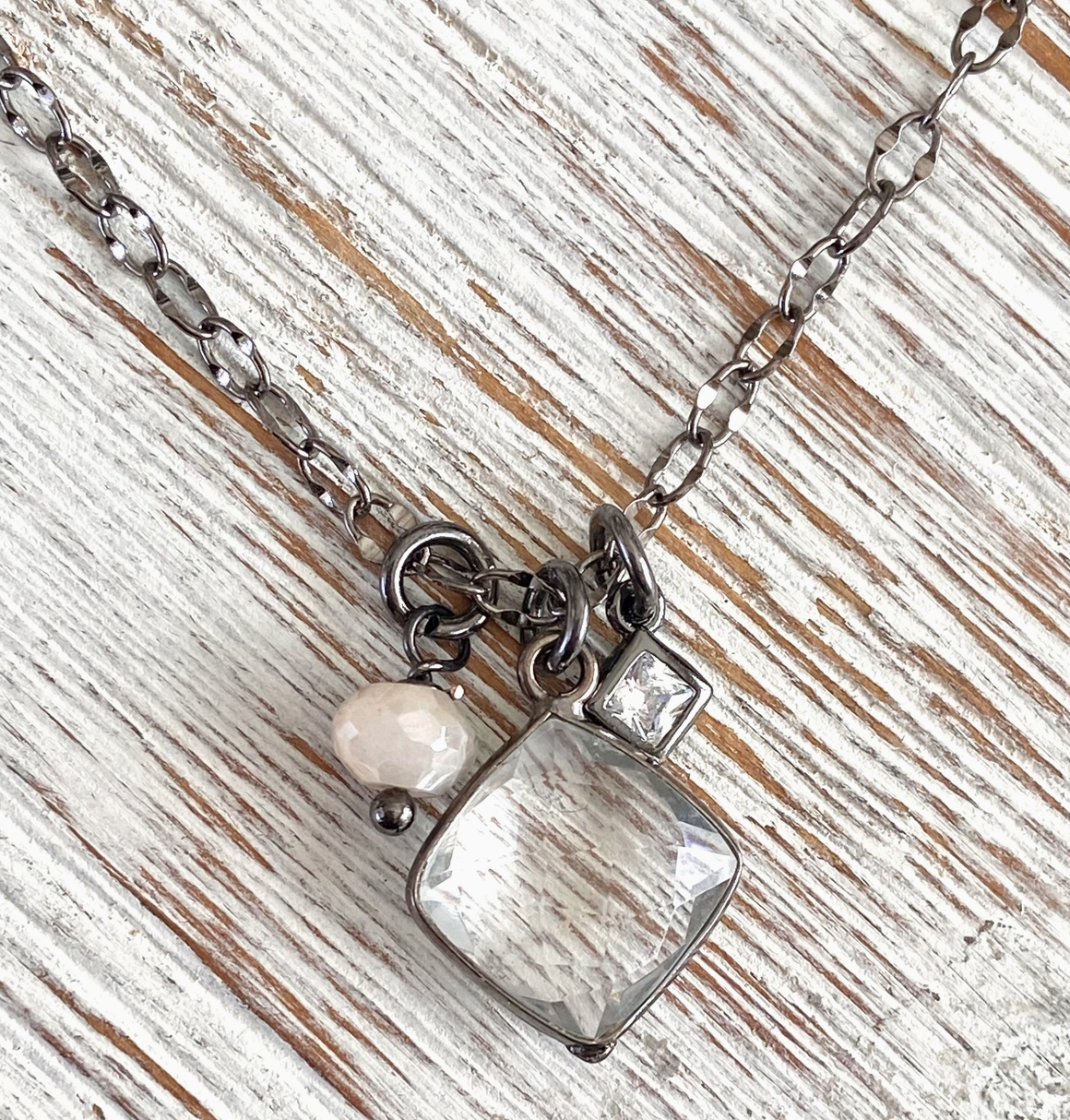 Our Moonstone Pearl Necklace, from VB&CO Designs Handmade Jewelry, combines the timeless elegance of pearls with the mystical allure of moonstones. This 18” necklace features genuine pearls, crystal quartz, and moonstone, creating a unique blend of classic and contemporary styles.