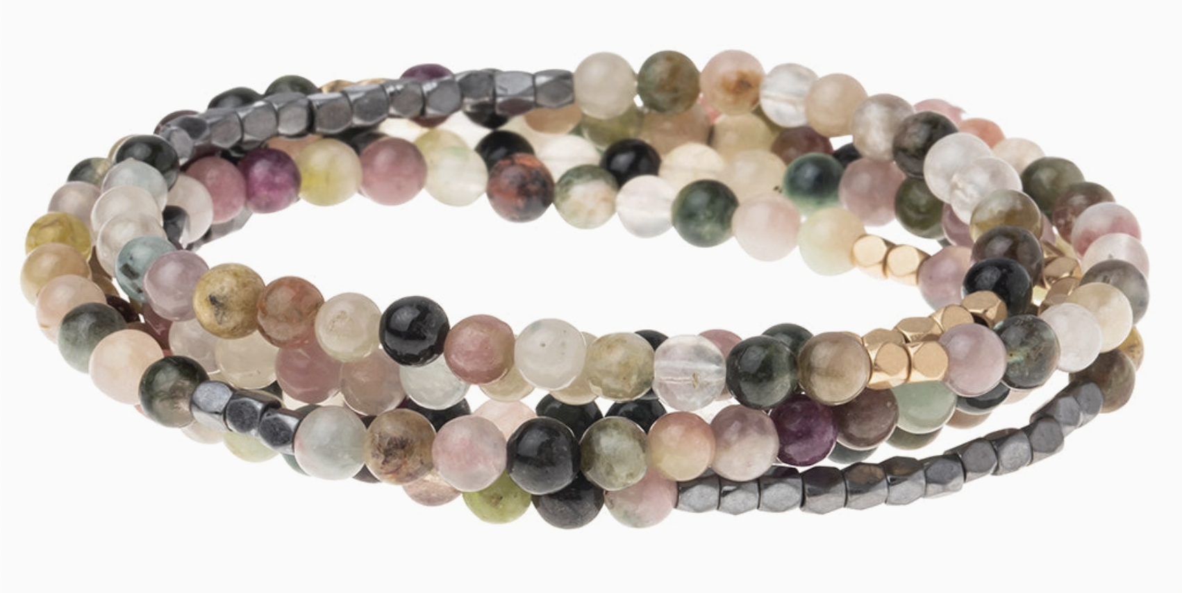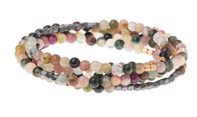 Tap into the energies of the earth. Semi precious gemstones adorn wrist & neckline. Effortlessly converts from bracelet to necklace. Can be wrapped 4-5 times as a bracelet and 1-2 times as a necklace. - 34" length