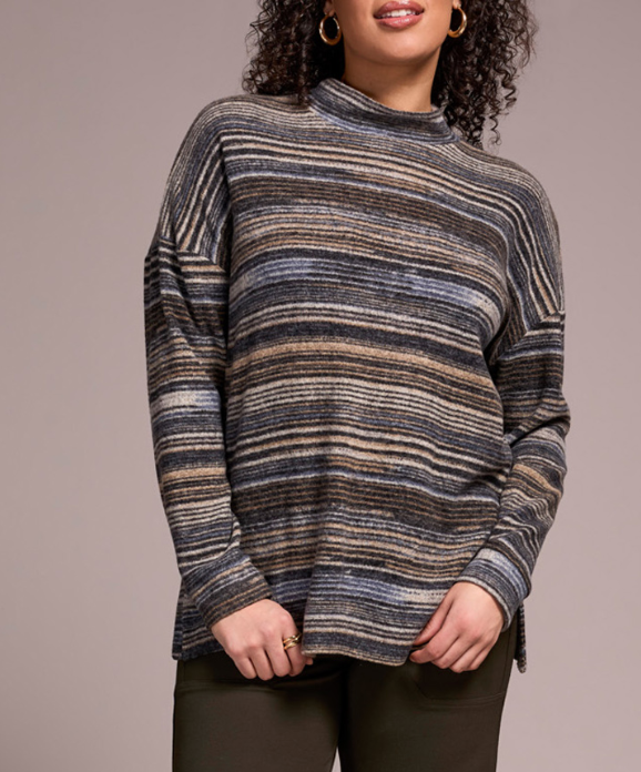 Stay cozy and stylish in this striped mock neck top crafted from a soft brushed knit. Long sleeves and a mock neckline offer warmth and coverage on cooler days. Side slits add a touch of ventilation and allow for ease of movement, making this piece as practical as it is chic.