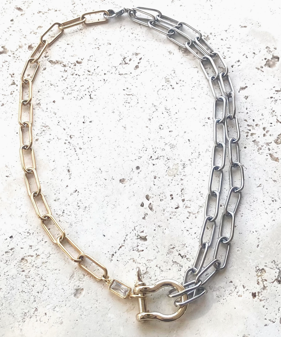 This necklace is so edgy glam and fun to wear. It features chunky paper clip stainless steel chains and a functional marine shackle clasp that you can wear alone or add your favorite charms or pendants. Lobster clasp closure at the back. 17”