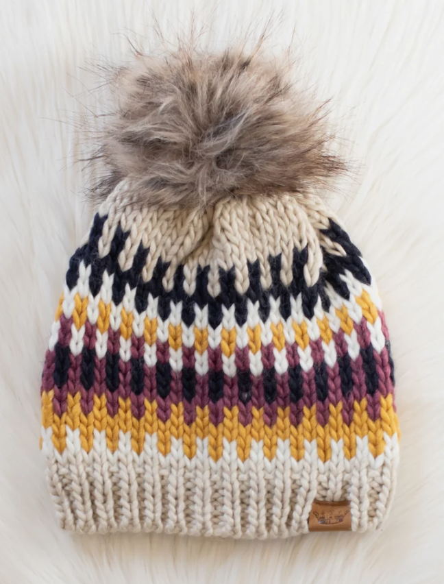 Patterned Pom Hat Beige/Navy/Gold/Plum