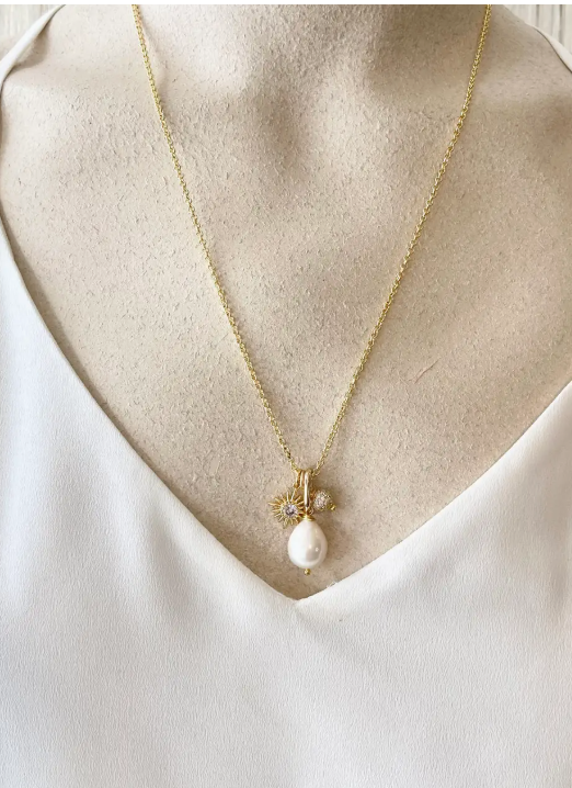 Baroque natural fresh water pearl cluster with a tiny sun charm and micro pave ball. On a non-tarnish gold chain. 20"