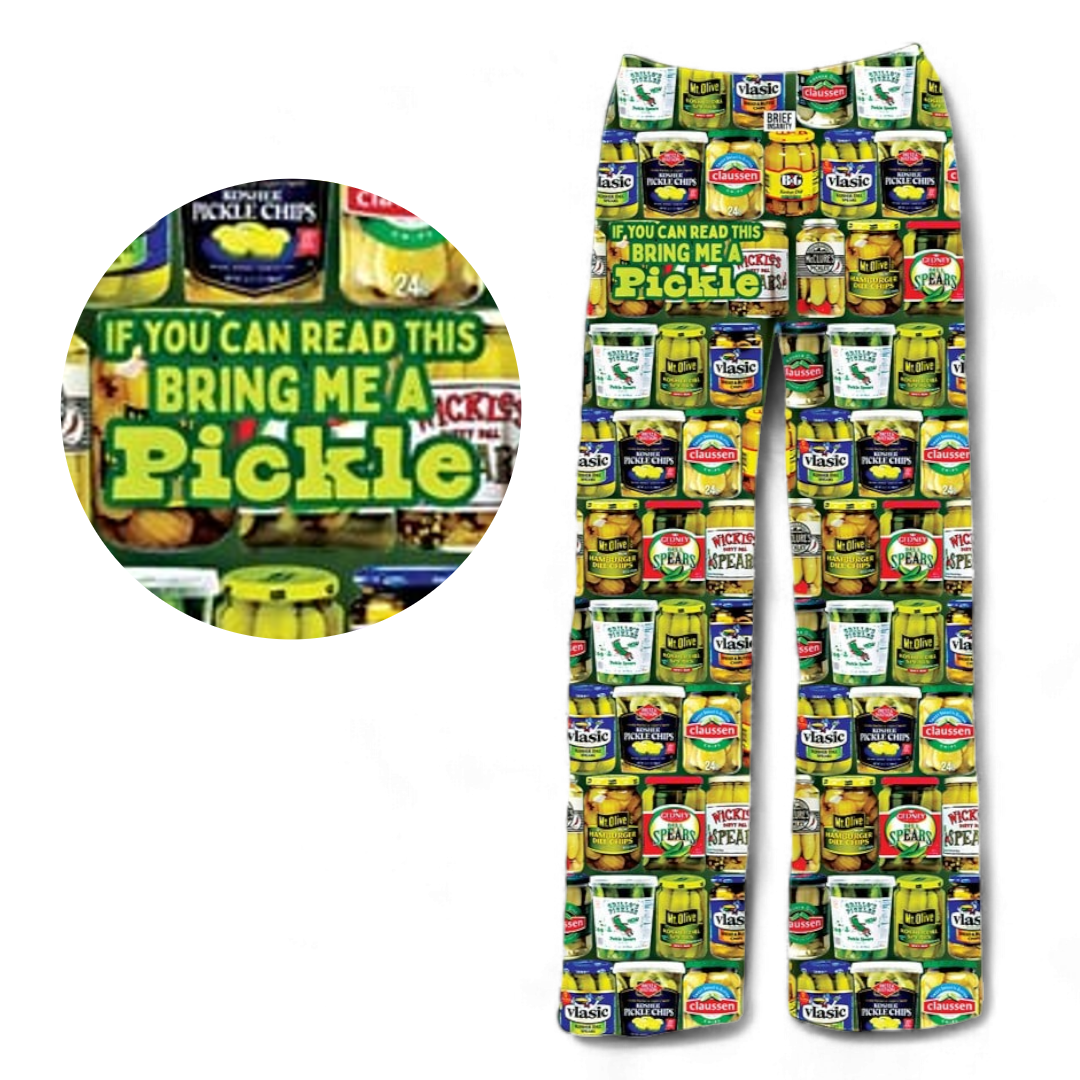 Calling all pickle lovers! These pants feature a collage of colorful jars of pickles. Lounging around is dill-lightful in these iconic Brief Insanity pants!