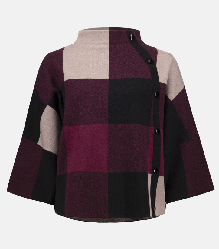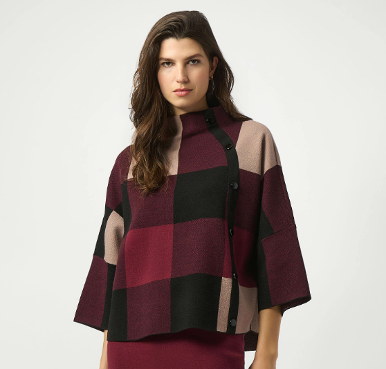 We all need a little plaid in our wardrobe. This cozy jacquard sweater knit top features a striking three-tone plaid pattern that's just as extraordinary as its design. A loose-fitting funnel neck adorned with decorative buttons on the side, along with three-quarter bell sleeves and a roomy fit give this piece an endlessly attractive appeal.