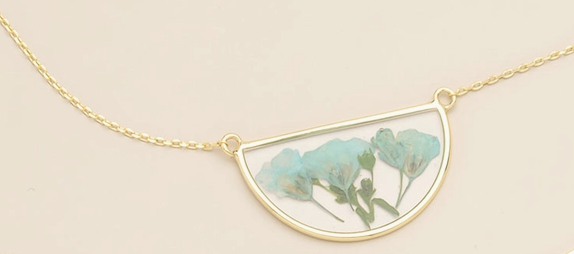 Wild blooms preserved to wear as lasting treasures of beauty; each piece holds a moment in nature to carry with you. Each necklace features natural, pressed flowers sealed with 14K gold dipped accents.   This collection is available in matching sets or as one-of-a-kind designs.  • 14k gold dipped brass, resin & dried flowers • Adjustable Chain measures 18" to 20" • Hypoallergenic & Nickel and Cadmium Free • Recommended to be displayed on the D01WHT   - Please Note: Each necklace is crafted using natural dried flowers. Slight variations in color & flower shape will add to the distinctive beauty of each piece.
