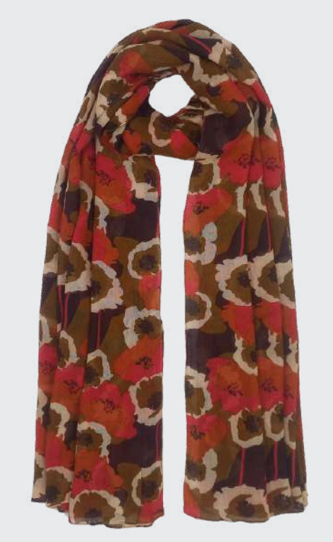 Brighten your wardrobe with the Maude VSA Red & Brown Poppy Scarf. This lightweight scarf showcases a playful poppy pattern in warm red and brown hues, making it a versatile accessory for layering over jackets, blouses, or dresses. Soft and easy to style, it adds a polished, vibrant accent to any outfit, perfect for casual or dressy looks alike.