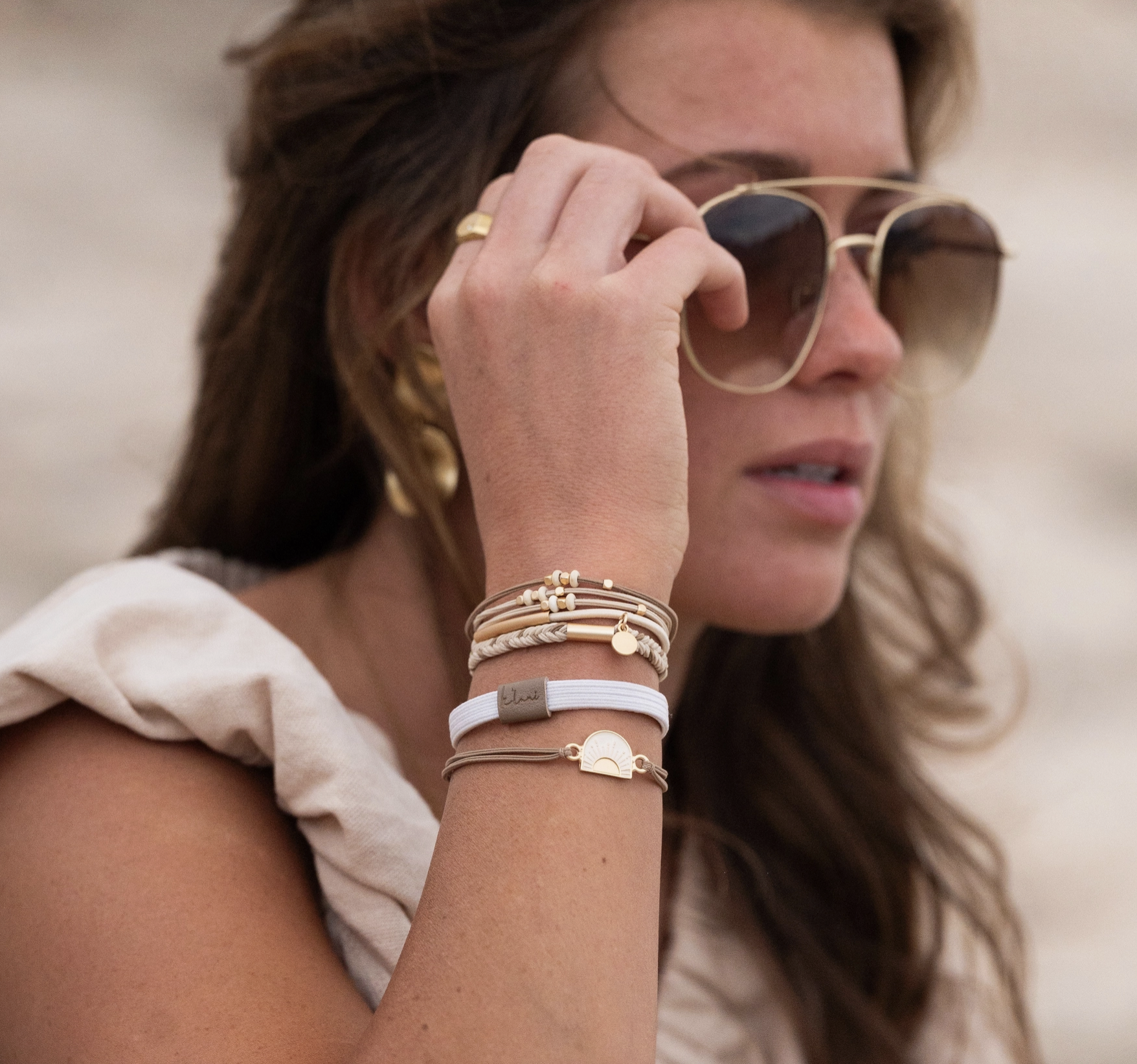 K'lani's Rise set includes five bracelets that double as hair ties in warm neutrals and gold and cream accents that will go with any outfit. The sunrise charm reminds us to rise up and shine every moment.