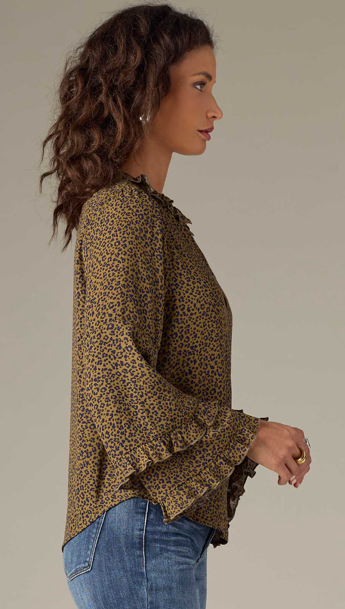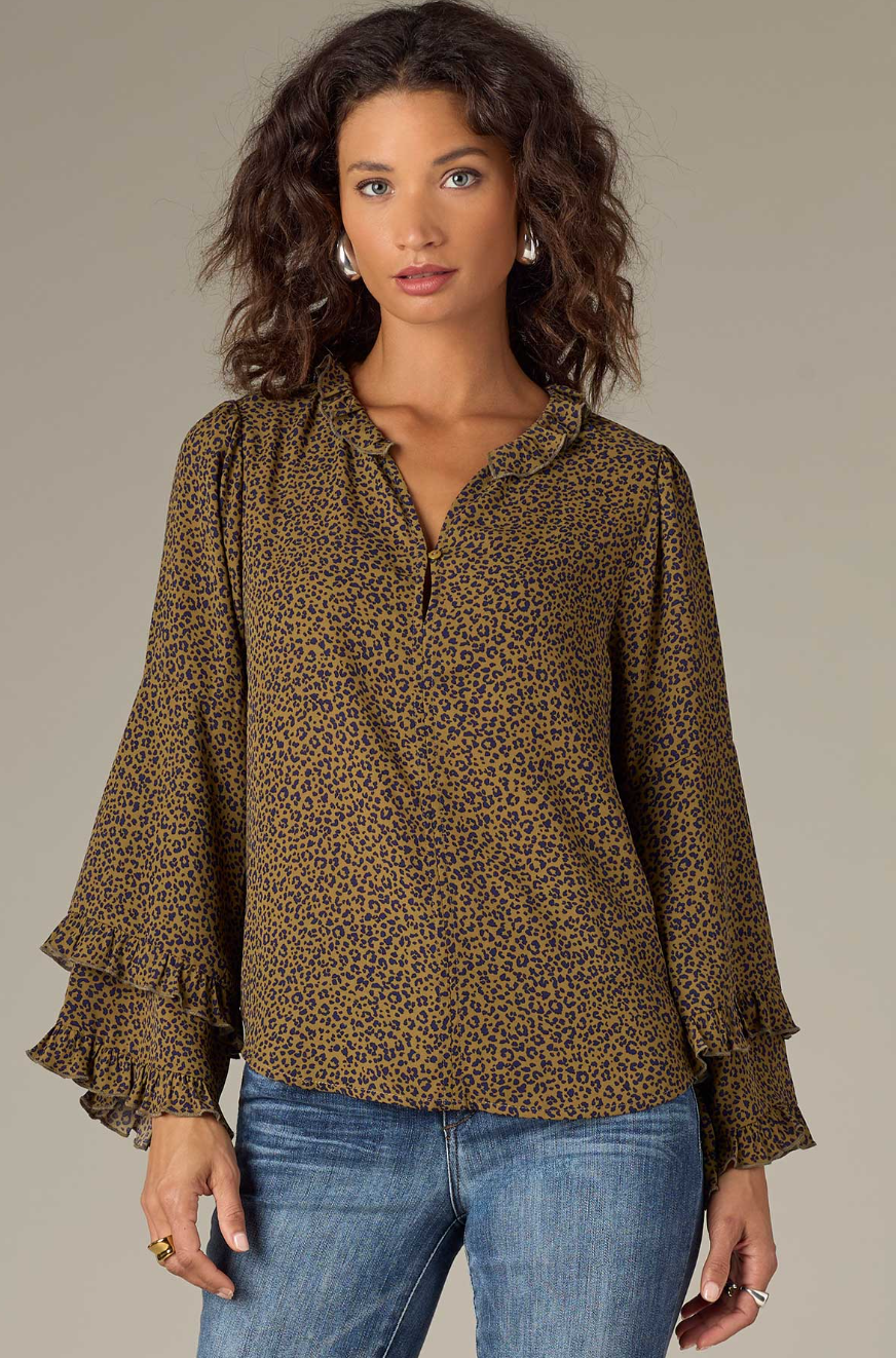 Dress up your look with this long romantic sleeve top in earthy hues. It’s designed with a ruffle split V-neck, button keyhole, front placket, and a round hem.