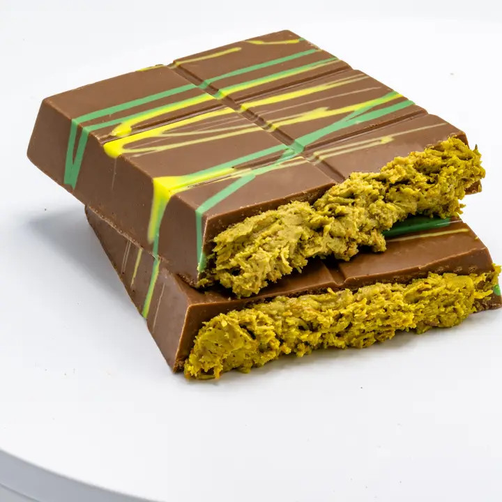 Rebellion in every bite—velvety couverture milk-chocolate armor cracks open to reveal a lavish, gooey pistachio-cream court, laced with rogue ribbons of knafeh that defy the tidy crunch of ordinary bars. PREMIUM COUVERTURE CHOCOLATE: Velvety real milk chocolate made with pure cocoa butter, never compound. 34 % PISTACHIO CREAM FILLING: Grade-A nuts ground fresh for intense, authentic flavor. SIGNATURE GOOEY KNAFEH: Delicate chew adds a Middle-Eastern street-dessert twist. GENEROUS 200 G BAR SIZE: Perfect for sharing, gifting, or royal self-indulgence. CLEAN-LABEL INGREDIENTS: Free from preservatives, palm oil, and hydrogenated fats; foil-sealed for flavor integrity.
