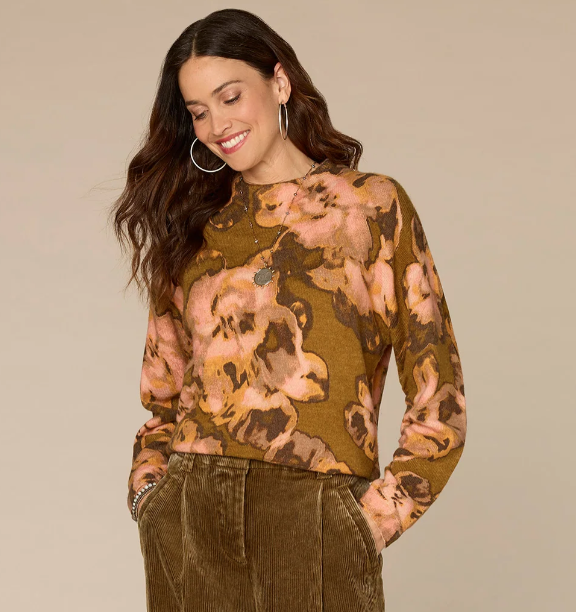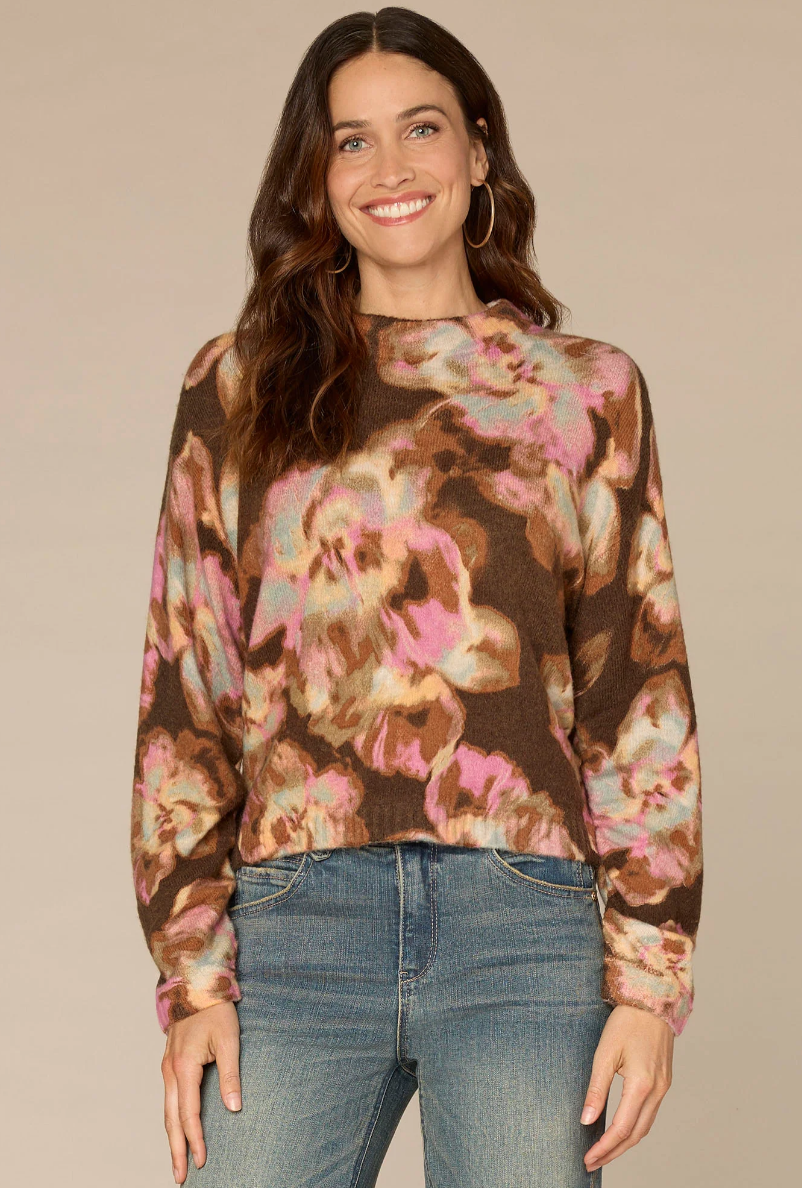 Make a statement in this abstract floral printed sweater. Its long ruched sleeves, round mock neck, and banded hem give this style a cozy feel while its versatile hues make it easy to pair with everything in your wardrobe.