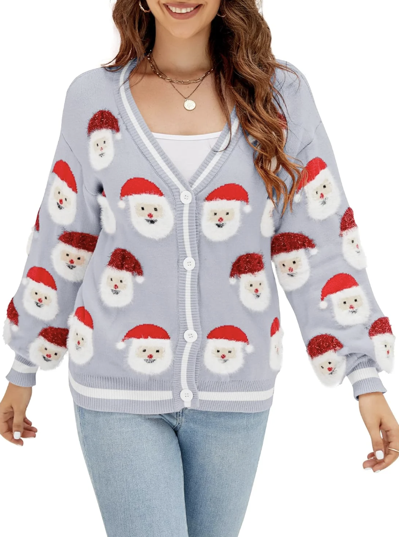 Celebrate the season in style with the Santa All Over Cardigan. Made from soft, cozy knit fabric, this festive cardigan is adorned with playful Santa motifs, making it the perfect choice for holiday parties, family gatherings, or casual winter wear. Its comfortable fit and cheerful design bring both warmth and holiday spirit to your wardrobe, ensuring you stay stylish and festive all season long. Pair it with your favorite jeans or leggings for a fun, holiday-ready outfit.