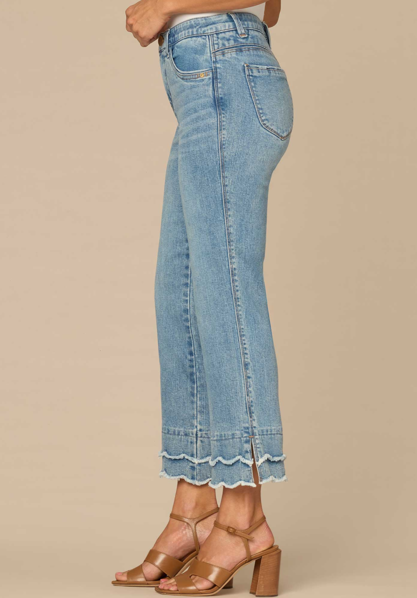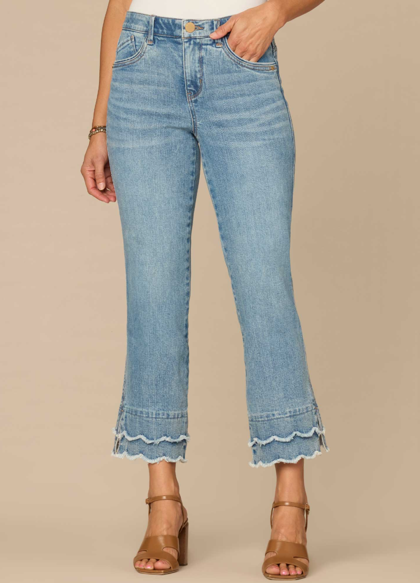 The Kick Flare jean skims your shape and finishes with a subtle flare at the above-ankle hem. Think Itty Bitty Boot, but cropped and with a double layered scallop fray hem. Engineered with “Ab”solution® fit technology, giving you everything from a flatter tummy to a perkier rear view.