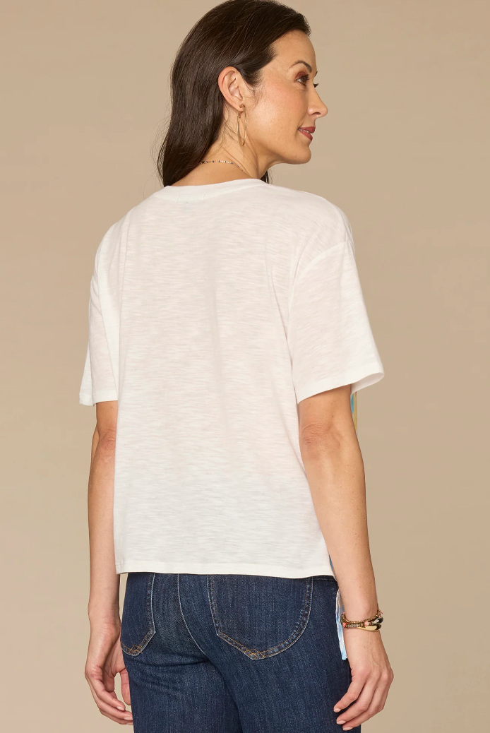 A vacation state of mind starts with this mixed media knit top. It has drop shoulder elbow-length sleeves, a scoop neck, side tie, and a colorful island-inspired print.