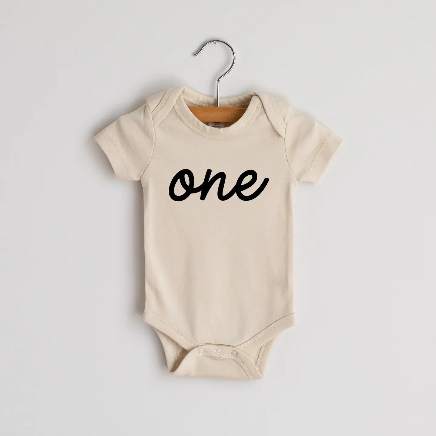 "One" • Happy birthday, little ONE! This super-soft, 100% organic cotton outfit features modern typography in crisp black ink on a cream colored bodysuit - designed with love and screen printed in-house.