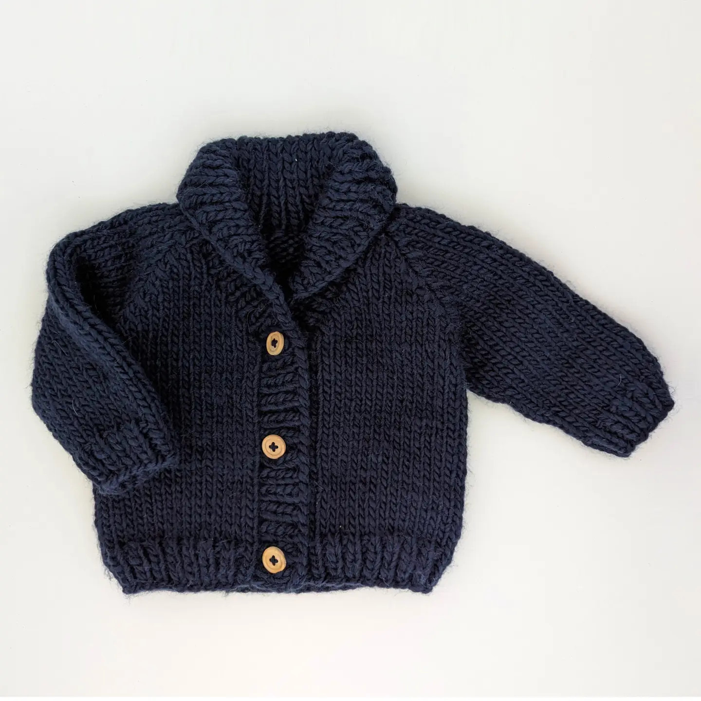 Here's a baby sweater that combines timeless style with modern comfort. This hand-knit chunky cardigan features a shawl collar and raglan sleeves, providing a fresh twist on a traditional design. Crafted from Indigo (navy) yarn, this sweater exudes elegance and sophistication. The natural wood buttons add a touch of classic charm, completing the look. Dress your little one in this cozy and stylish sweater for a truly adorable ensemble. Our sweaters are partially knit from recycled, sustainable Polyester yarn made from plastic bottles. We are on a mission to help reduce the world's plastic pollution problem ♻