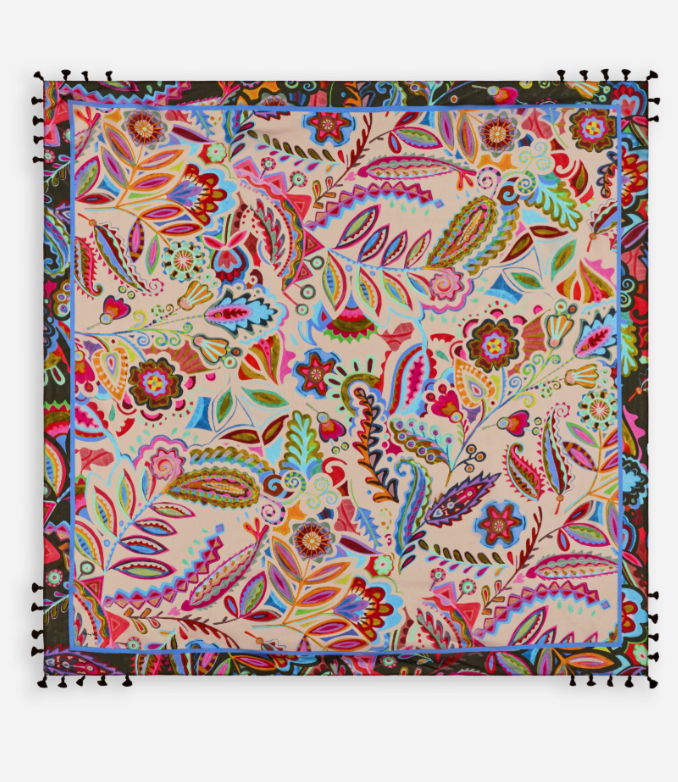 Embellished with an eye-catching floral print, the Silvana Silk Scarf from Johnny Was adds beauty and elegance to any look. Crafted from 100% luxurious silk, this stunning scarf is finished with a bold print and contrasting border and features tassels at each corner. Wear tied at the neck or on the handle of your favorite bag for a pop of color and enhanced texture.