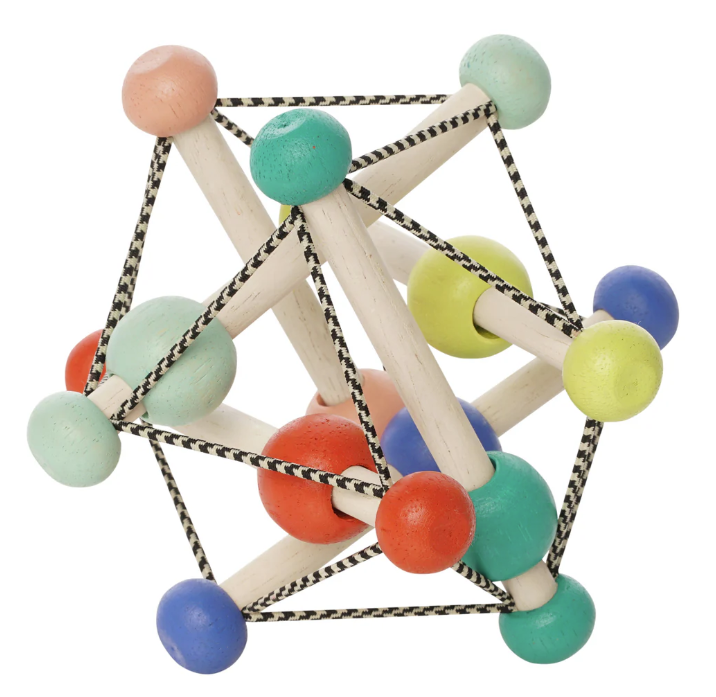 Enjoy, this one-of-a-kind squishable wooden rattle and teether toy that is made from renewable rubberwood and strung together with durable elastic cords!