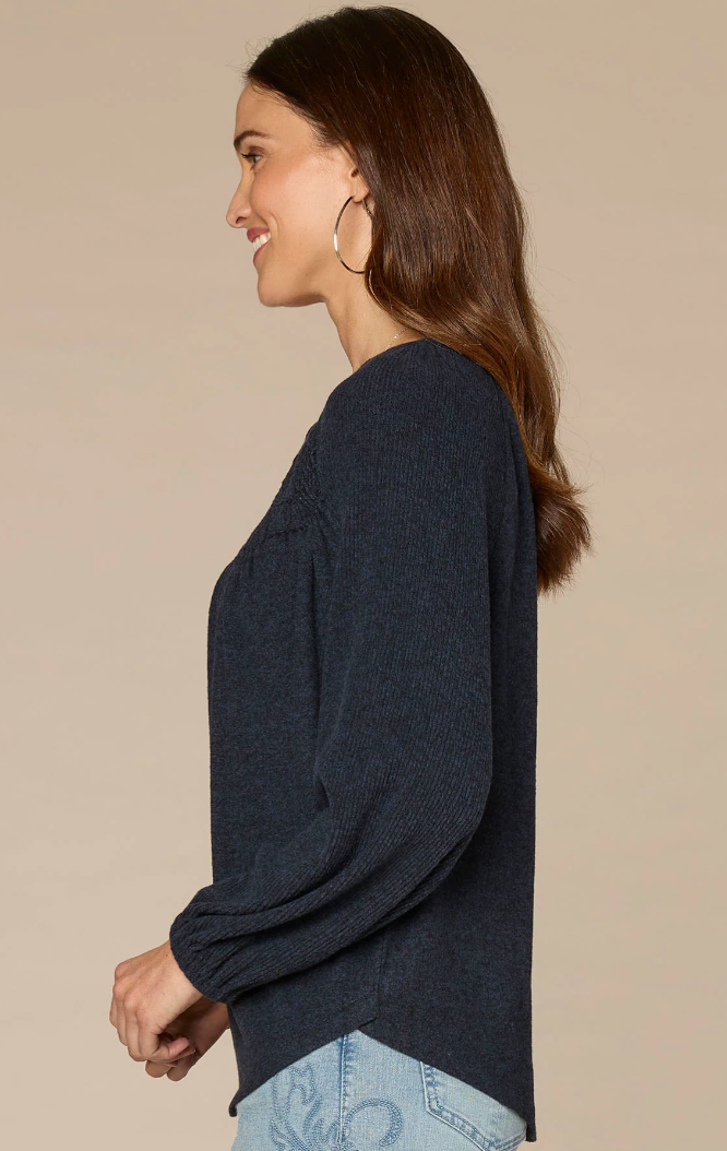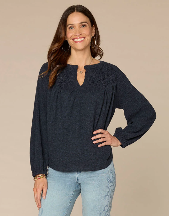 Meet your latest wear-anywhere style. This fresh knit top has long blouson sleeves, a split V-neck, half placket, and on-trend novelty smocking detailing.