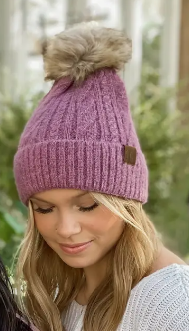 Embrace classic winter style with the Soft Cuff Cable Knit Fur Pom Hat. Made from soft, cozy cable-knit material, this hat features a snug cuff to keep out the cold and a playful faux-fur pom on top for added flair. Ideal for chilly days, it provides warmth without sacrificing on trendy, timeless design.