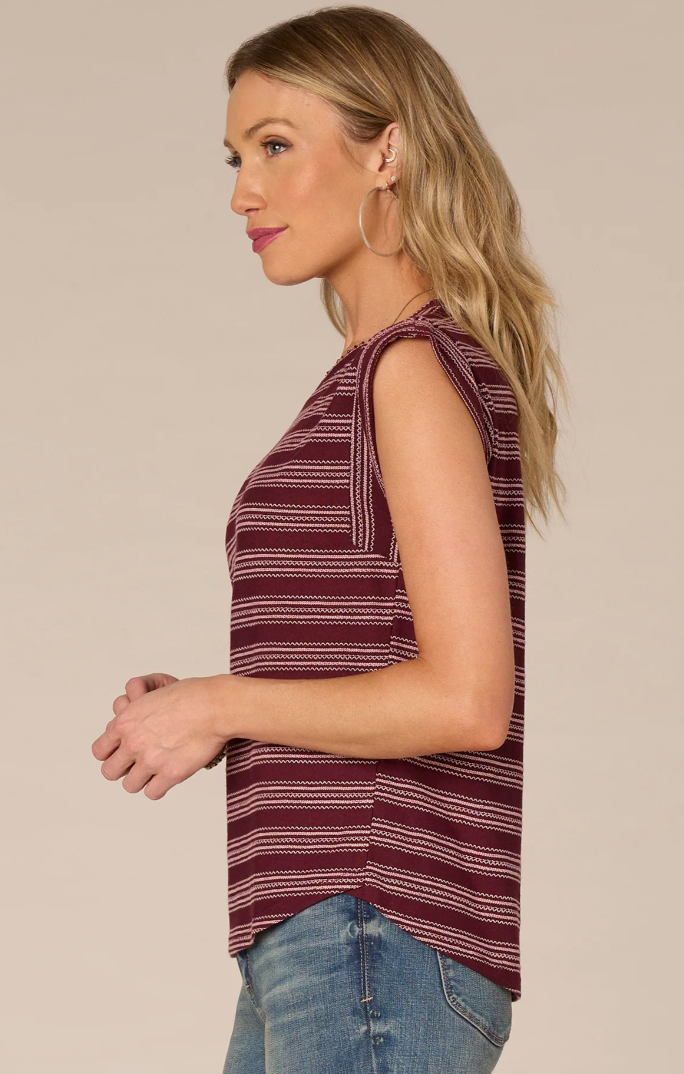 This striped knit top is an easy outfit-maker with a scoop neck, cap sleeves, and a surplus shirttail hem. Its soft feel and casual fit make it ideal for warm days or cool-weather layering.