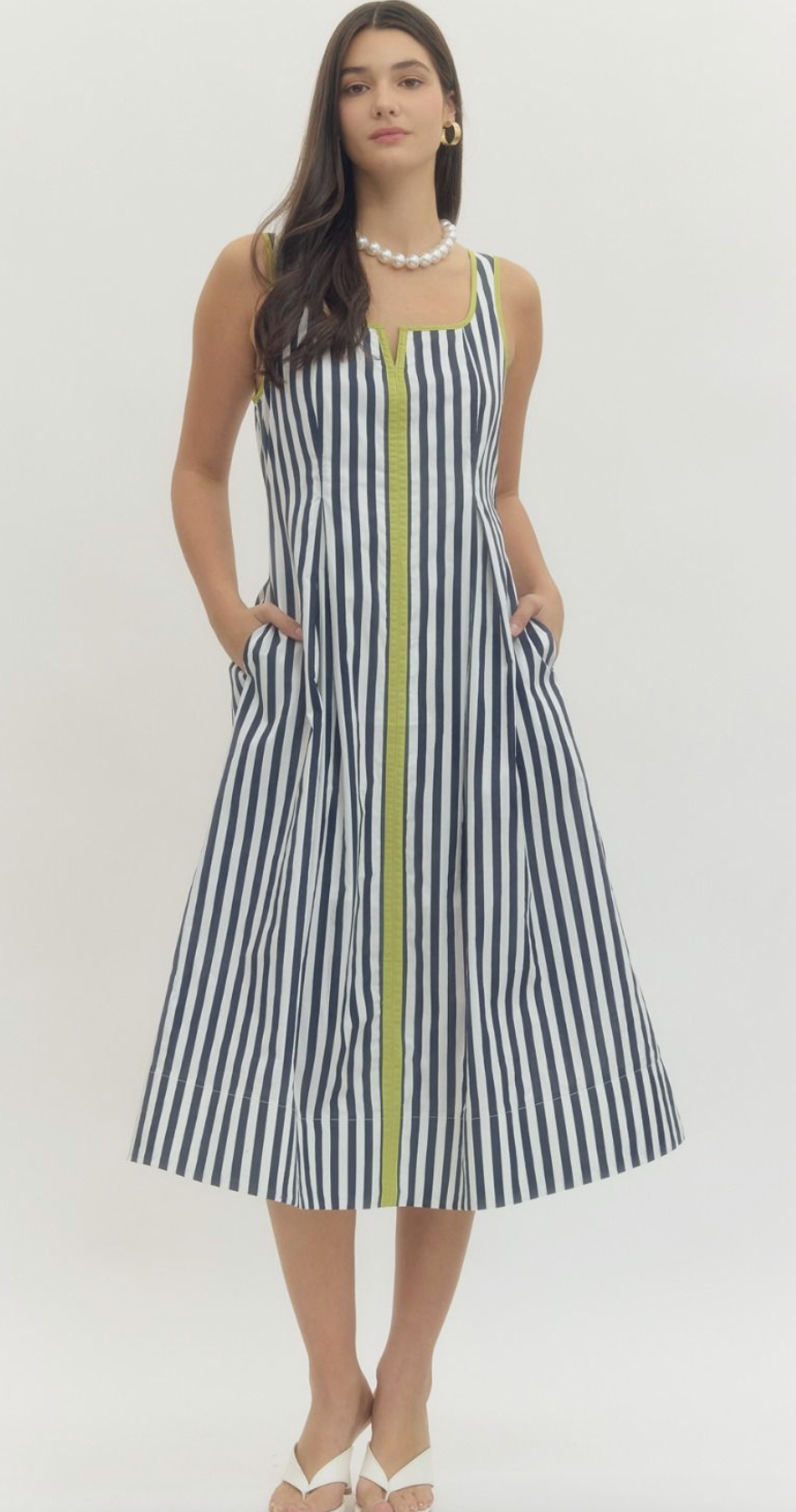 Striped sleeveless midi dress featuring contrast trim and V-cut neckline. Zipper closure at side. Lined. Woven. Non-sheer. Lightweight.