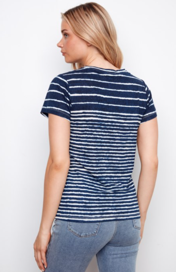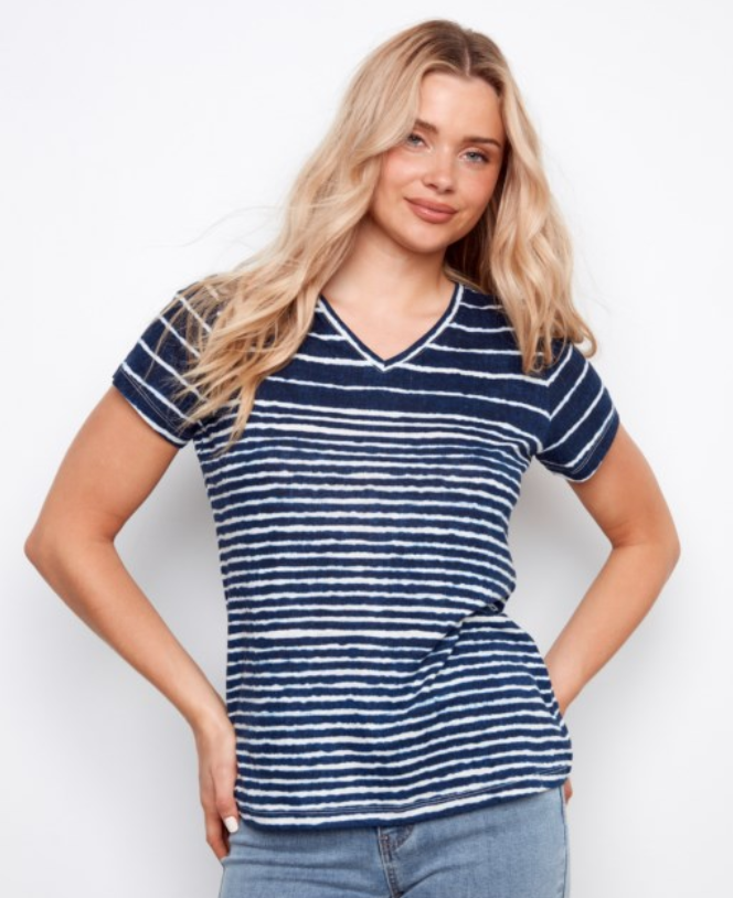 Charlie B’s Navy Stripe V-Neck T-Shirt offers a timeless, casual look with classic navy stripes and a flattering V-neckline. Made from soft, breathable fabric, it delivers all-day comfort and easy wearability. Its versatile design pairs effortlessly with jeans, shorts, or skirts, making it a go-to staple for relaxed everyday style.