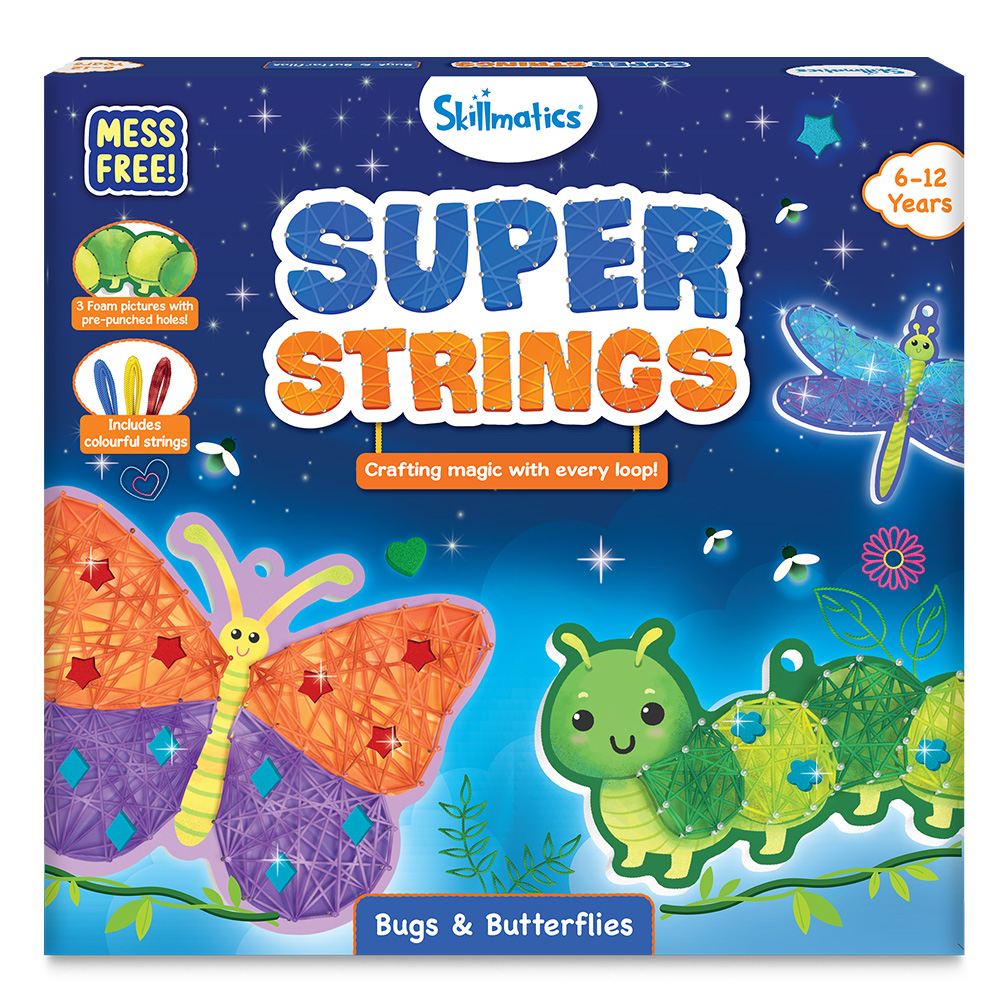 Snap in the pins and wrap colorful strings to create dazzling designs—no glue, no mess!